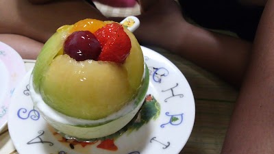 これは何メロンっていうんだ? 瓜のような外観で、網目の無い、やや小さめのメロン。これ1個を繰り抜いて、半分を土台に使って中には熟した果肉。他にイチゴとナニヤラの実とカスタードクリームがたっぷり。スポンジケーキのようなものも入っている。