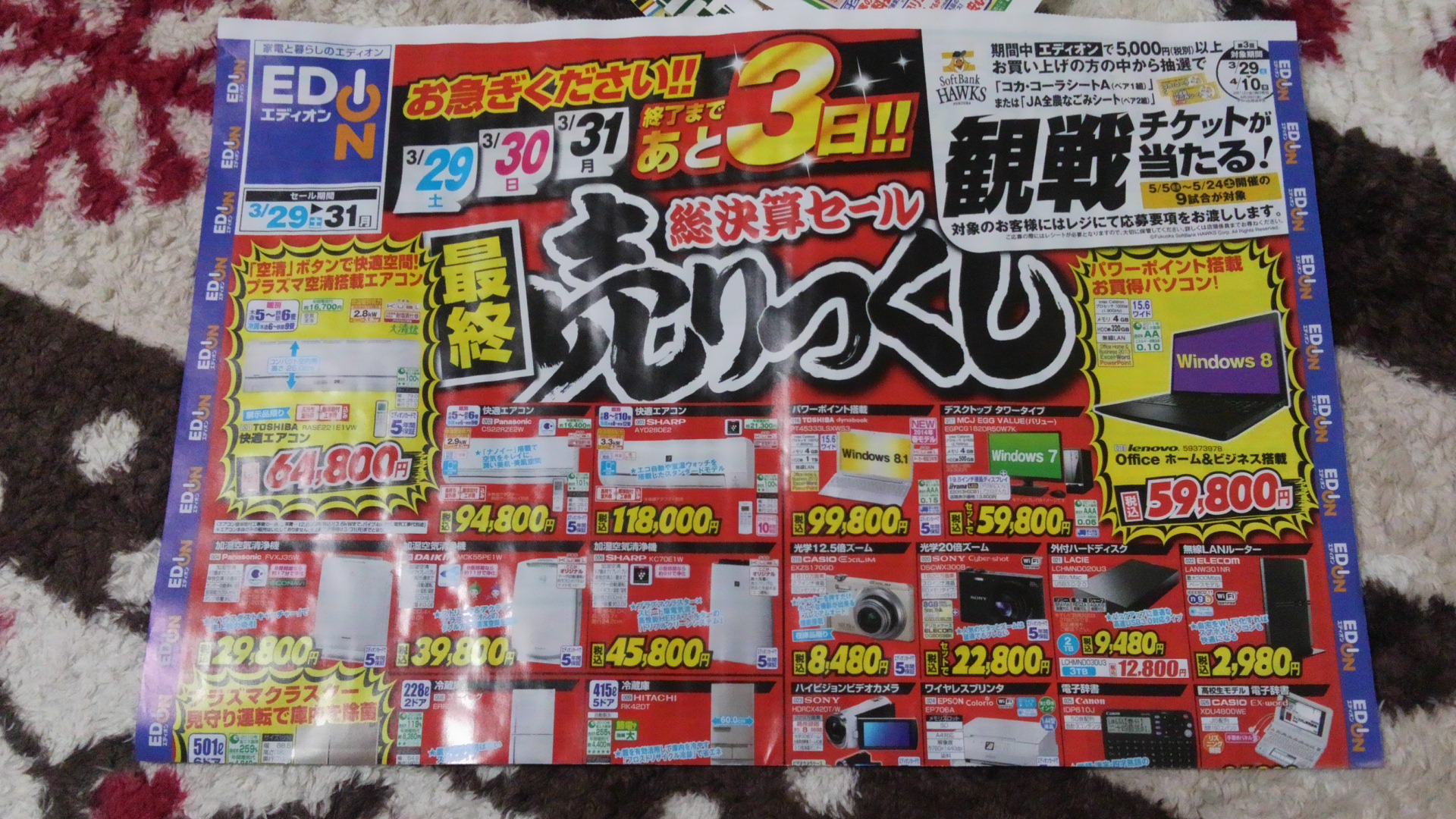 アプライドや電気屋のEdionなどにも電話をかけてみたが品薄、もしくは売り切れ状態。範囲を広げてチラシ掲載のLenovoノートパソコンも検討してみたが同様に品薄状態。