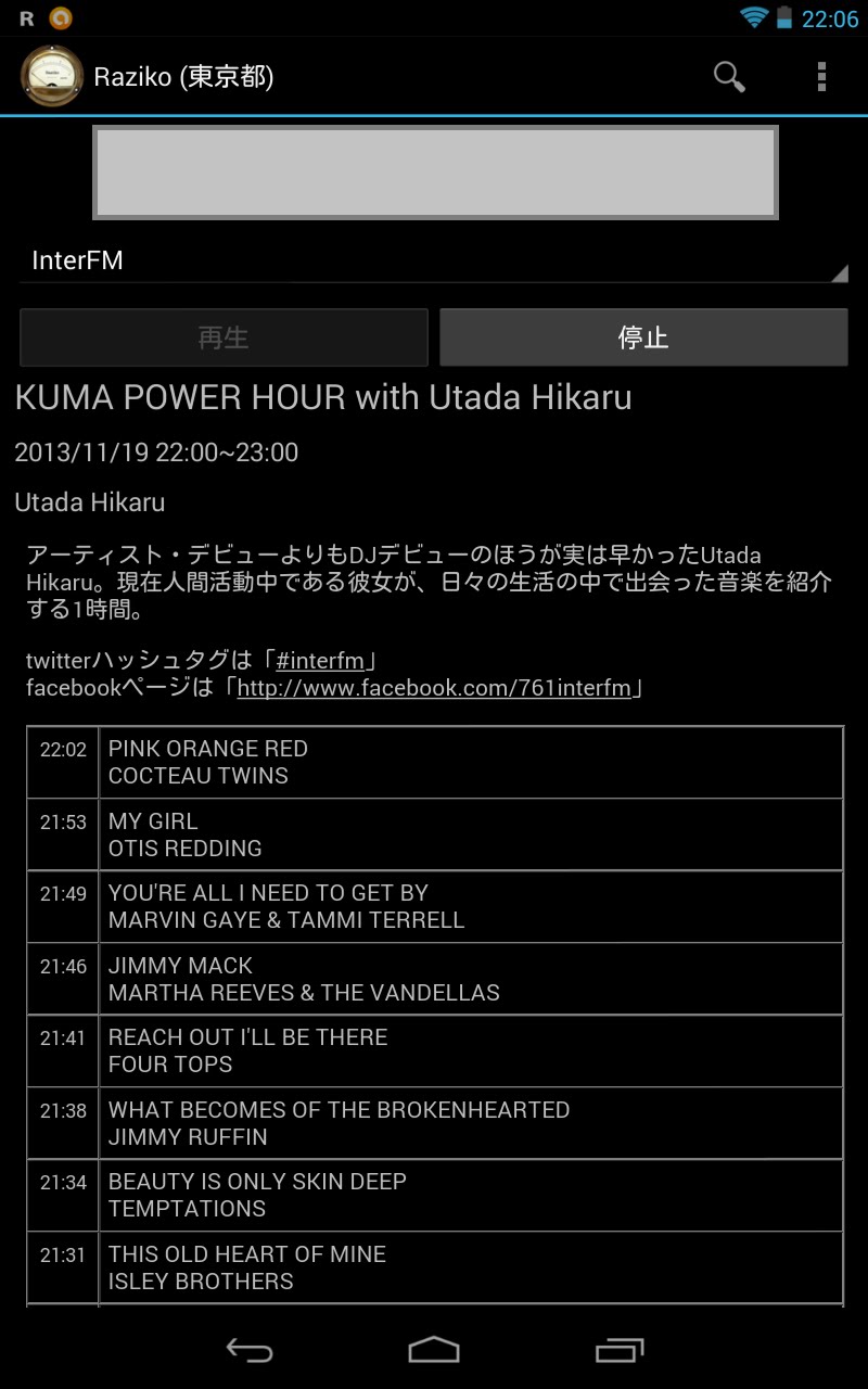 「Raziko」を起動します。メニューっていうのかNexus7では右上のレンズマーク横の「:」(実際は点が3つ)マークから「番組情報の表示」をタップしてInterFMを選択します。InterFMが表示されていない場合は局名部分を横方向にドラッグして探してみて。