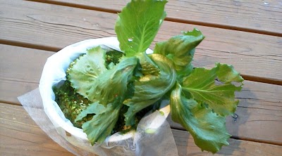 葉レタスの中央の葉っぱは残して再び洗濯テラスへ移動。そうやっておくと少しだけ増える。