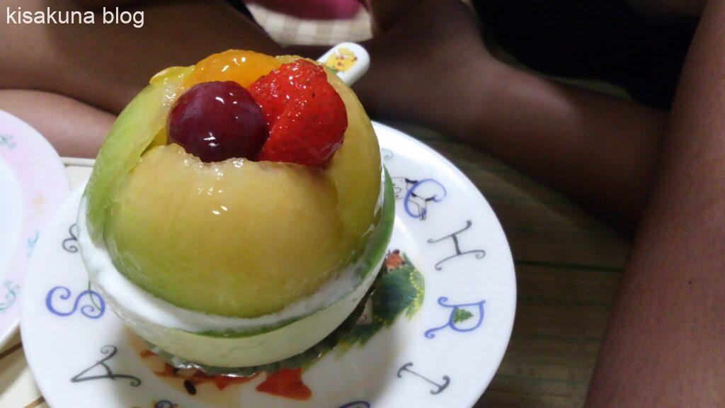 これは何メロンっていうんだ? 瓜のような外観で、網目の無い、やや小さめのメロン。これ1個を繰り抜いて、半分を土台に使って中には熟した果肉。他にイチゴとナニヤラの実とカスタードクリームがたっぷり。スポンジケーキのようなものも入っている。