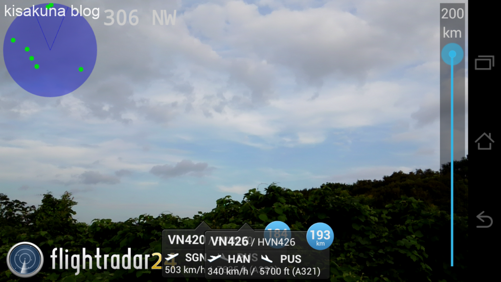 スマホ版で特に気に入ったのが「* 機器を空にかざすだけで、上空を飛んでいる飛行機を識別できます」ってヤツ。画面右上の「AR」アイコンをタップするとカメラの様な画面に切り替わる。その画面のまま水平線辺りを狙ってグルグル動かしていくと飛行機が飛んでいれば表示される。