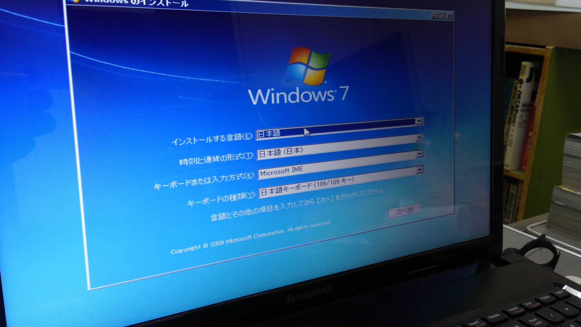 Windows7のインストール画面が表示されているのでUSBブートは成功。とりあえずブート出来るかの実験なのでインストールは中止した。