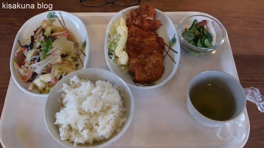 ちなみに料理は「華さん食堂」で、好みの一品料理を取ってきたもの。チキンカツ+野菜炒め+タコ酢+ご飯(小)で合計508円。お茶や水は無料で飲み放題…だと思う。