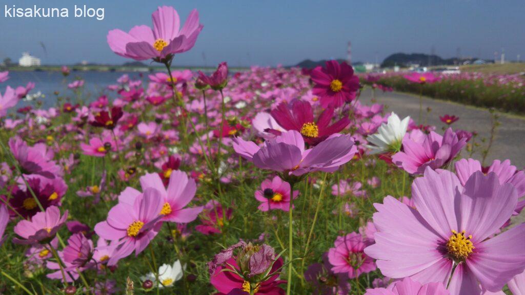 (´ヘ`;)ウーム…どのような違いがあるのかアチキの頭ではよく分からん… 日の丸構図ってやらないほうがいいと思ってがアリなんやね。ま、いいや、とにかくいろいろ撮影してみよ!…などと、思う前に出かけてみた時、ちょうどいい具合に遠賀川河川敷の秋桜が目に入った。写真の撮り方サイトは未だ見ていない時のお話。