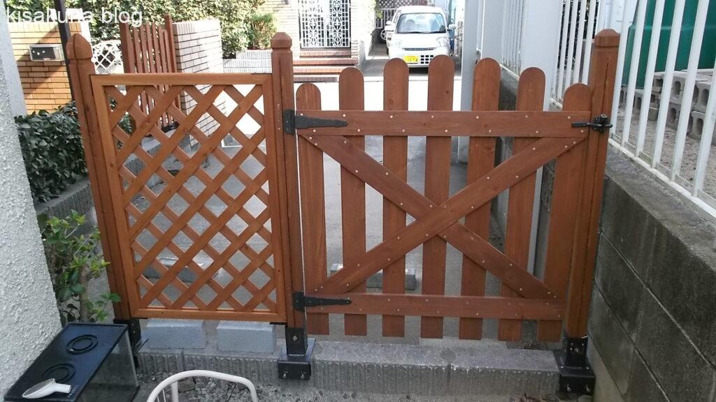 ブロック塀の反対側の支柱はラティスを取り付けるので都合がいい。合計二本の支柱でスパンを稼げるので、扉が下がるモーメントを吸収してくれるだろう。