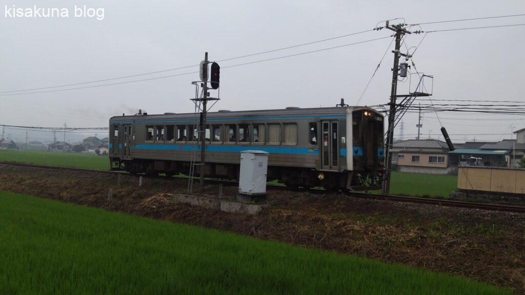 自動車を停めて付近を見渡すと、田んぼの中に鉄道が通ってる。柵などは無くむき出しの線路。そうだ!こんな時鉄道Nowで調べれば一発で分かるぞ!