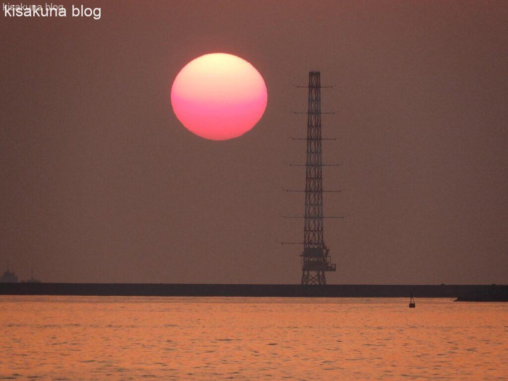玄界灘に沈む夕陽まっかっか🌇 高い塔みたいのはなんじゃらほい? 北九州 pic.twitter.com/JqPjMrH1or