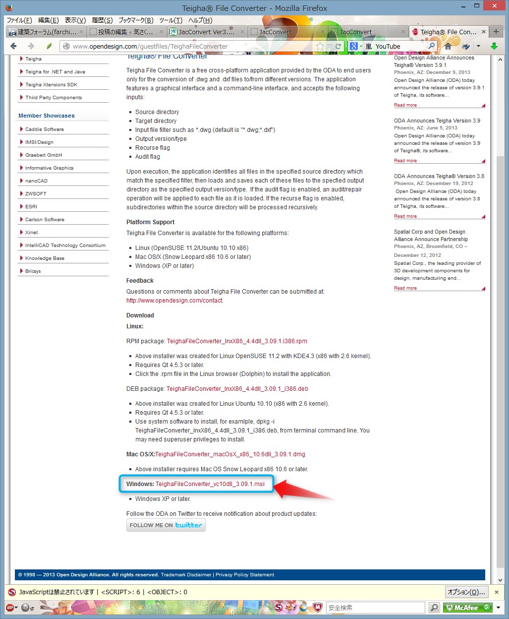次はダウンロードのページが開く。今回はWindows用のTeighaFileConverterなので、下部にある「TeighaFileConverter_vc10dll_3.09.1.msi」をクリック。