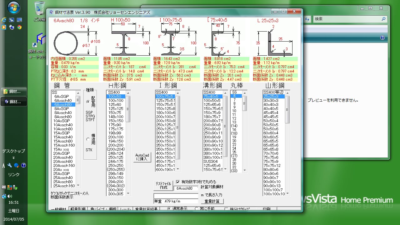 「鋼材表示プログラム Version 3.9」はVistaにインストールしていた。起動してみると問題なく表示された。